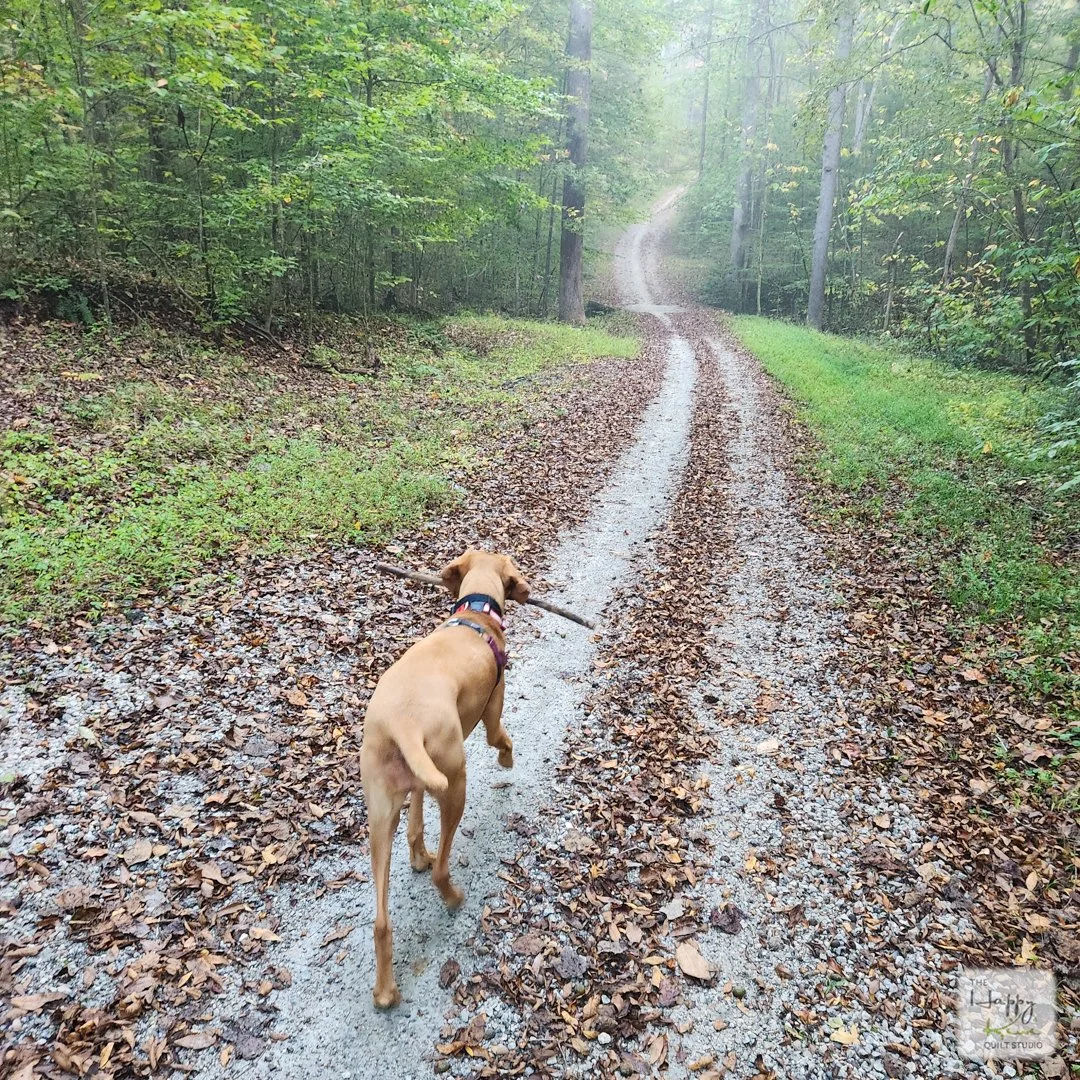 Here’s Gracie from this morning, stick in mouth, on a mission. The weather was no longer offensively damp, so she decided we could resume our regularly scheduled squirrel patrol.